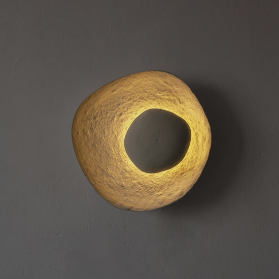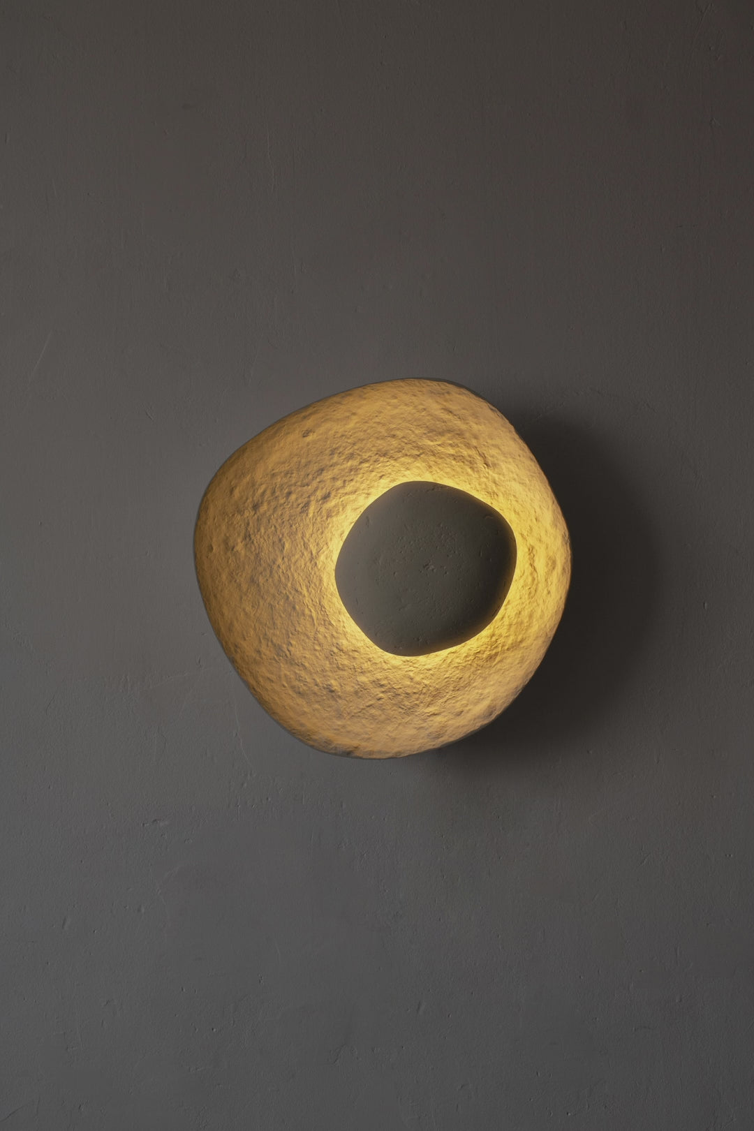 Inspirada en la luna vista desde las profundidades del océano —como explica Szymon— su superficie desigual y llena de cráteres cobra vida al iluminarse, creando un efecto marcadamente escultórico. La lámpara cuenta con una fuente de luz oculta suavizada por una capa exterior, lo que la hace amable con los ojos y emite una luz suave y acogedora.